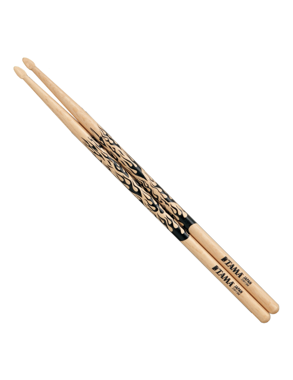 Baquetas Tama 5A-F Oak Japanese Fire -NTapresentam um design gráfico tribal original TAMA, produzidas  em carvalho japonês extremamente duro com comprimento de 406 mm e 14 mm de diâmetro.