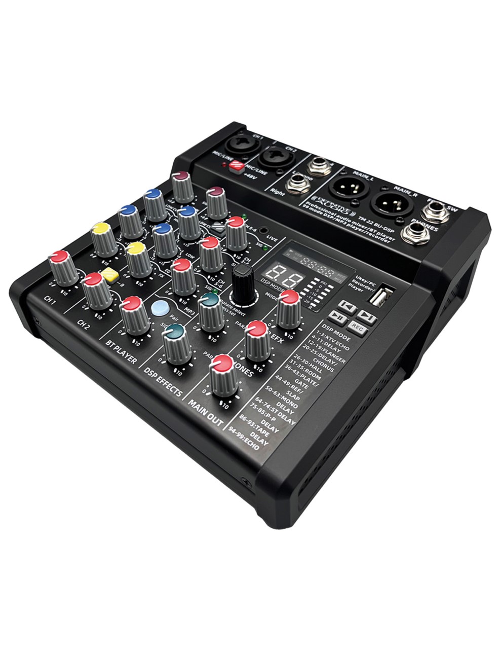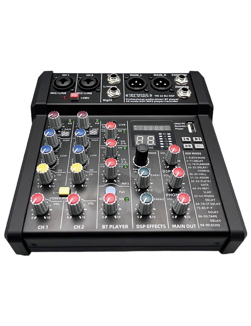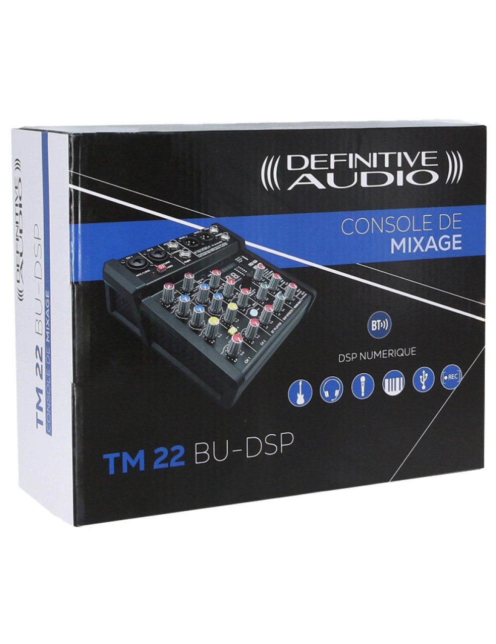 Descubra a Mesa de Mistura Definitive Audio TM 22BU DSP – A escolha perfeita para os amantes da música! Procurando por uma mesa de mistura pequena de alta qualidade? A Definitive Audio TM 22BU DSP é a escolha perfeita. Esta mesa de mistura oferece uma experiência de som incomparável face ao seu preço. Com a TM 22BU DSP, você pode criar e misturar suas próprias faixas com facilidade. Seu design intuitivo e recursos avançados permitem que você controle cada especto do seu som, proporcionando a liberdade criativa que você precisa para produzir música excecional. A Definitive Audio é conhecida por sua qualidade e confiabilidade, tornando a TM 22BU DSP uma adição valiosa para qualquer configuração seja você um DJ profissional ou um entusiasta da música. Com 5 canais, conceção Bluetooth integrado e um leitor/gravador USB MP3/WAV/APE/FLAC.