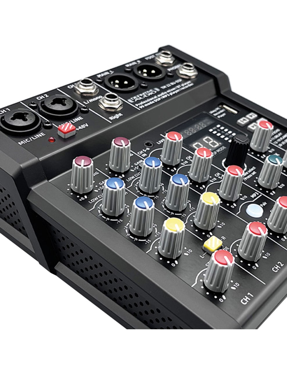 • Conectividade: Possui 2 combos XLR/Jack, 2 Jacks mono 6.35mm e 1 AUX jack 3.5mm, oferecendo uma ampla gama de opções de conectividade. Além disso, possui Bluetooth integrado e um leitor/gravador USB MP3/WAV/APE/FLAC.