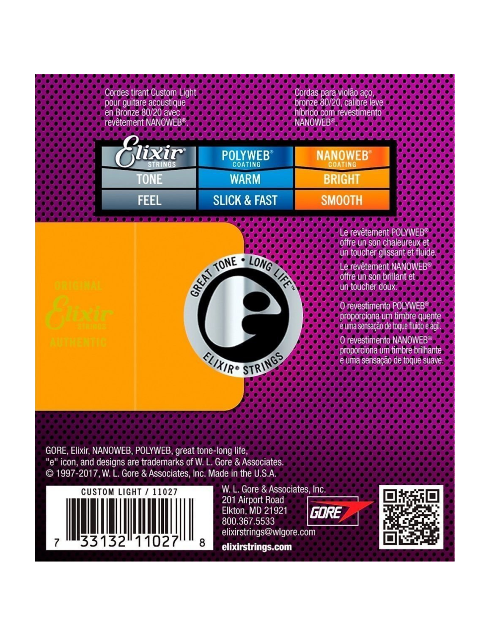 Jogo Cordas Guitarra Acústica Light  Elixir 11027. Em  Bronze com NANOWEB com as medidas .011, .015, .022, .032, .042, .052 .