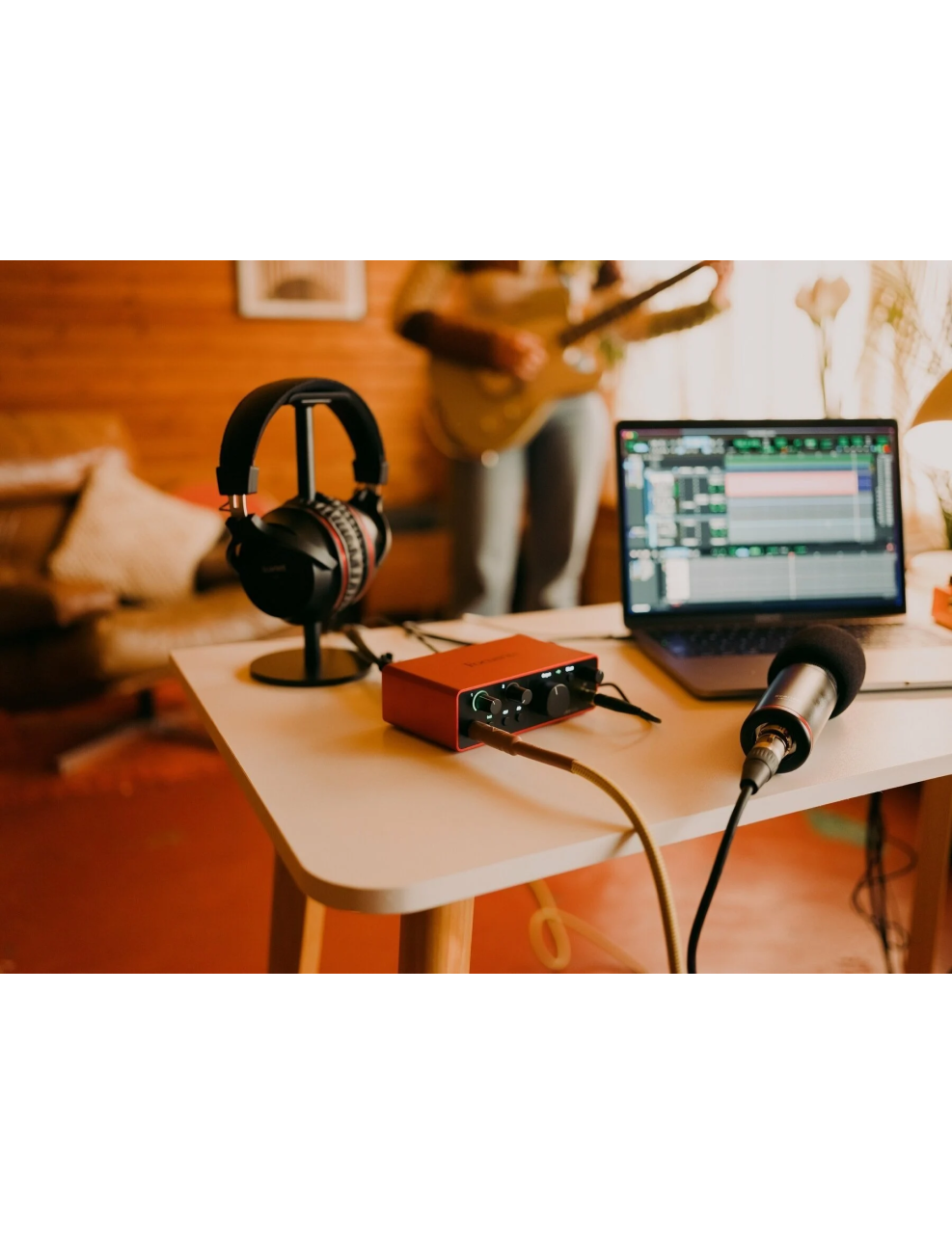 - Pré-amplificador de microfone Scarlett: Capaz de capturar cada parte da sua performance com detalhes ricos e claros.