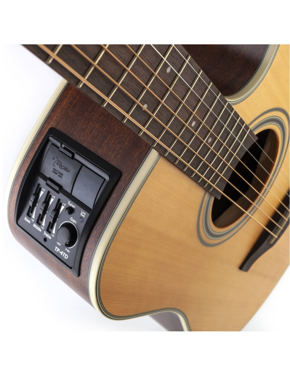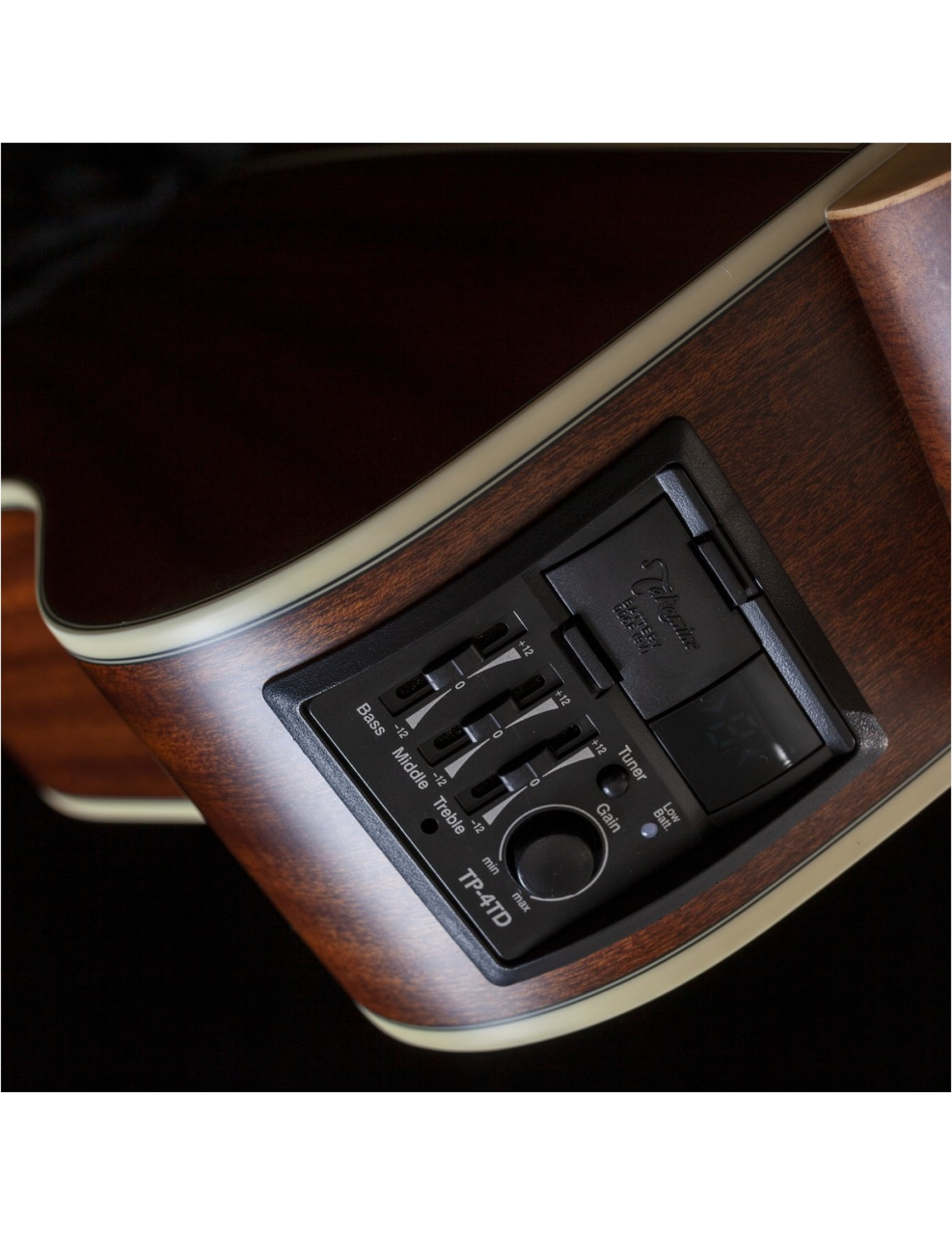 Takamine GD20CE-NS, possui um sistema de pré-amplificação e afinador integrado com equalizador de três bandas e controles de ganho para excelente desempenho amplificado e versatilidade.