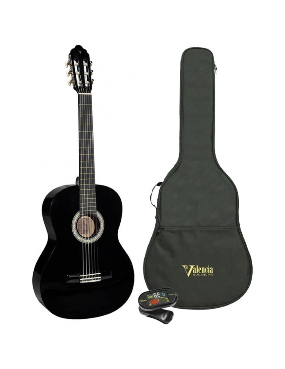 Pack de guitarra clássica com afinador e saco de nylon, Tamanho de 4/4 em cor Preta.